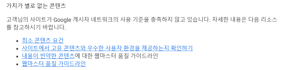 복제 콘텐츠가 있거나 가치가 없는(... 뭐 그런 것 같기도🙄) 콘텐츠라 그런다고 한다.