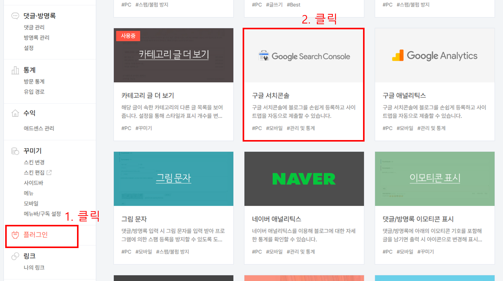 1. 티스토리 관리자 페이지에서 플러그인으로 들어가서 구글 서치콘솔을 클릭한다.
