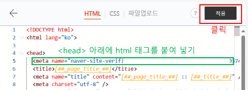 6. <head> 밑 줄에 아까 네이버 서치어드바이저에서 복사한 html 태그를 붙여넣기 해주고 적용을 클릭한다.