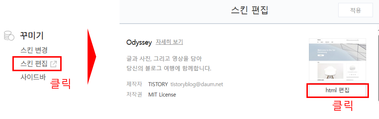 5. 이제 자신의 티스토리로 접속하여 스킨 편집 항목으로 들어가고 html 편집을 누른다.