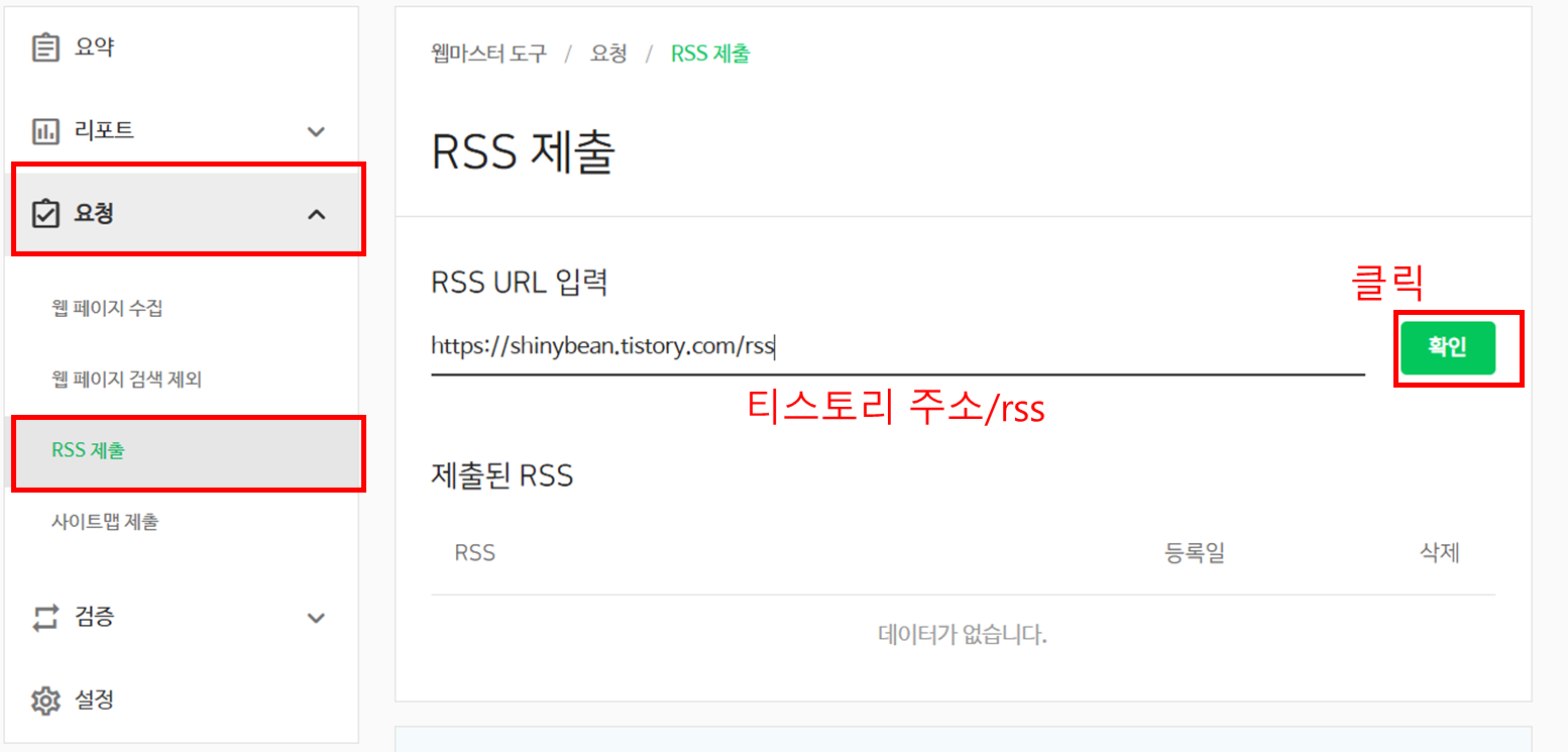 10. 요청 항목에서 /rss 주소와 /sitemap.xml 주소를 넣어주고 확인을 누르면 끝