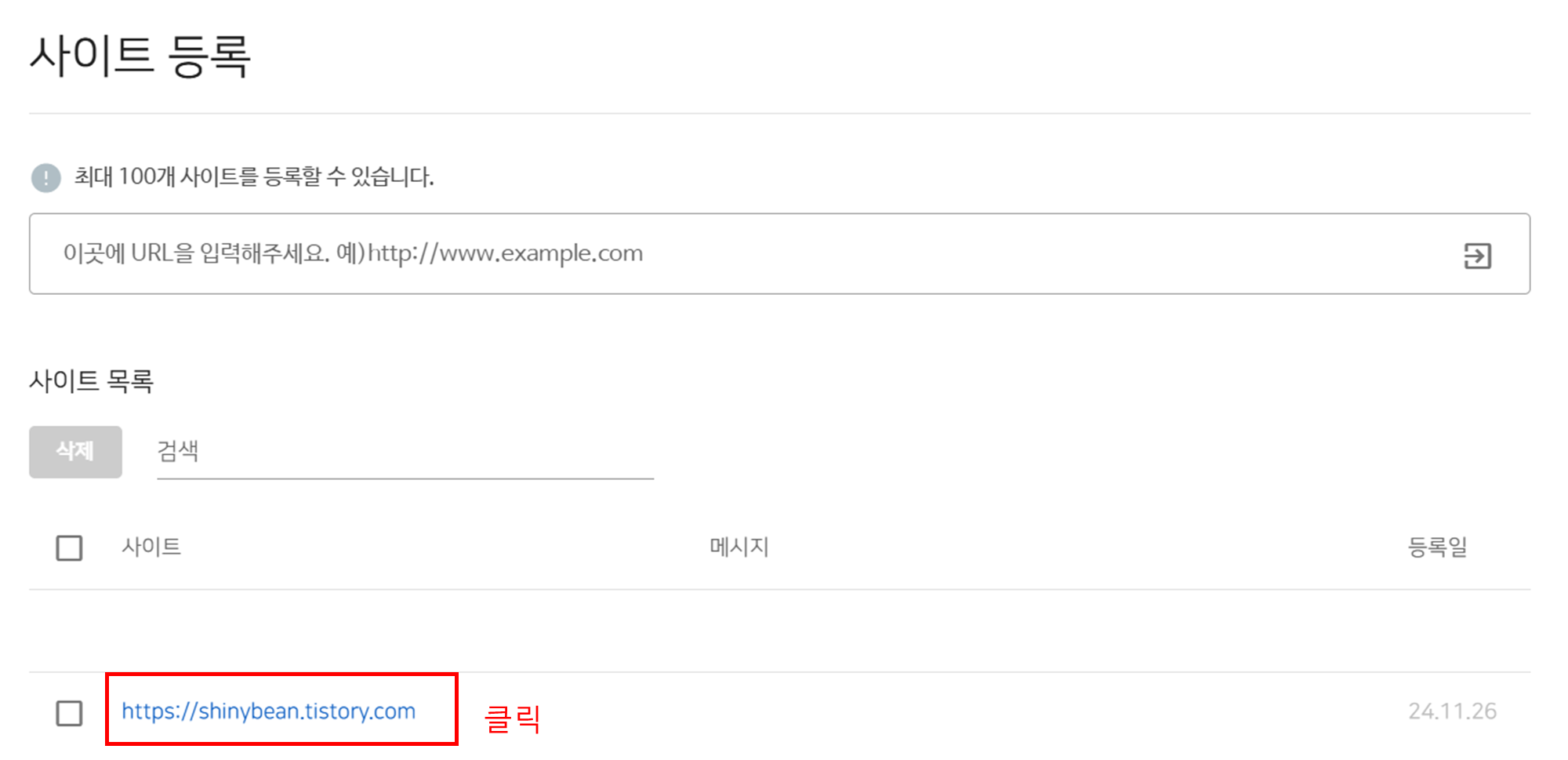 9. 그러면 아래 처럼 내 티스토리가 사이트 목록에 뜨게 된다. 주소를 클릭하자.