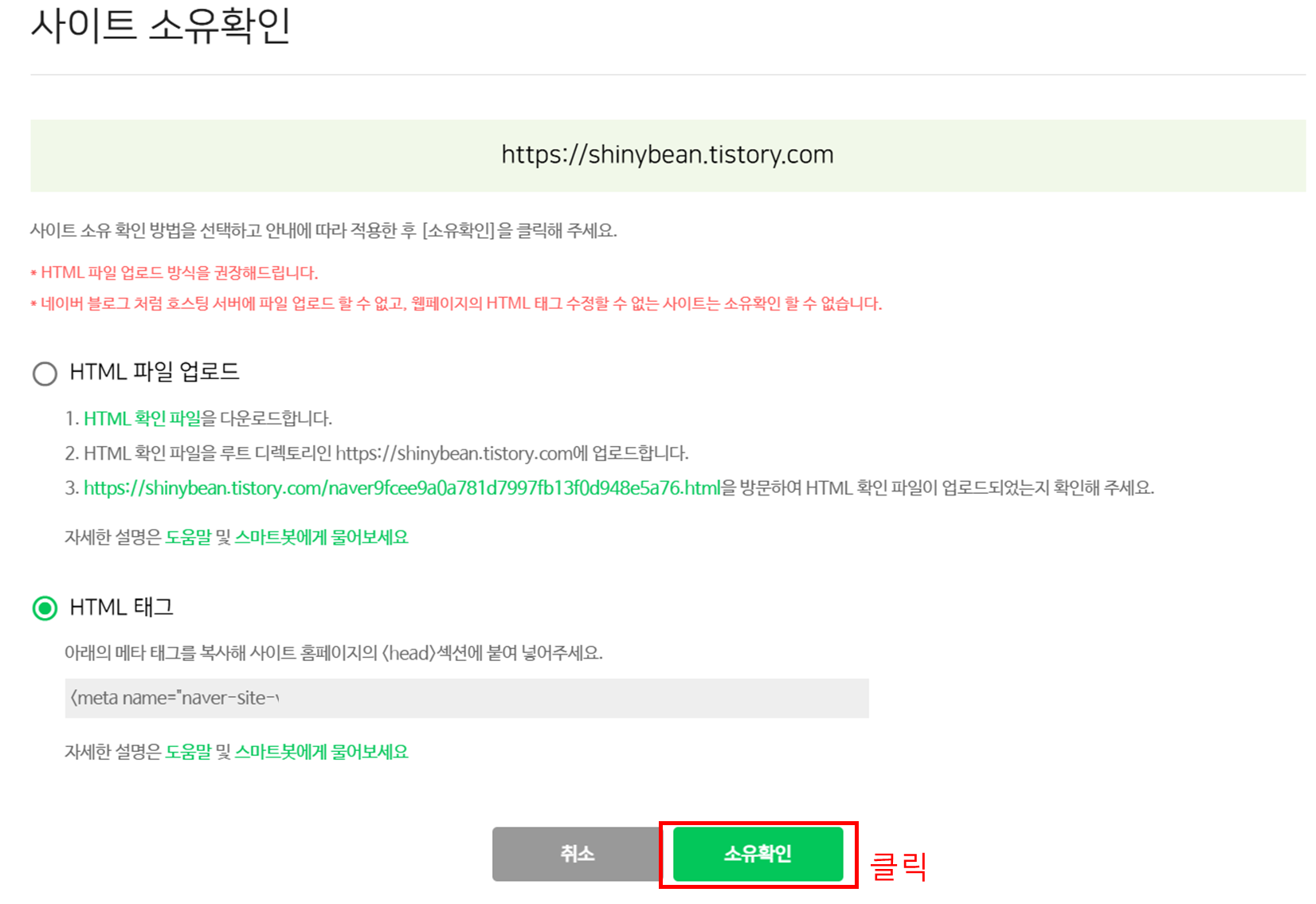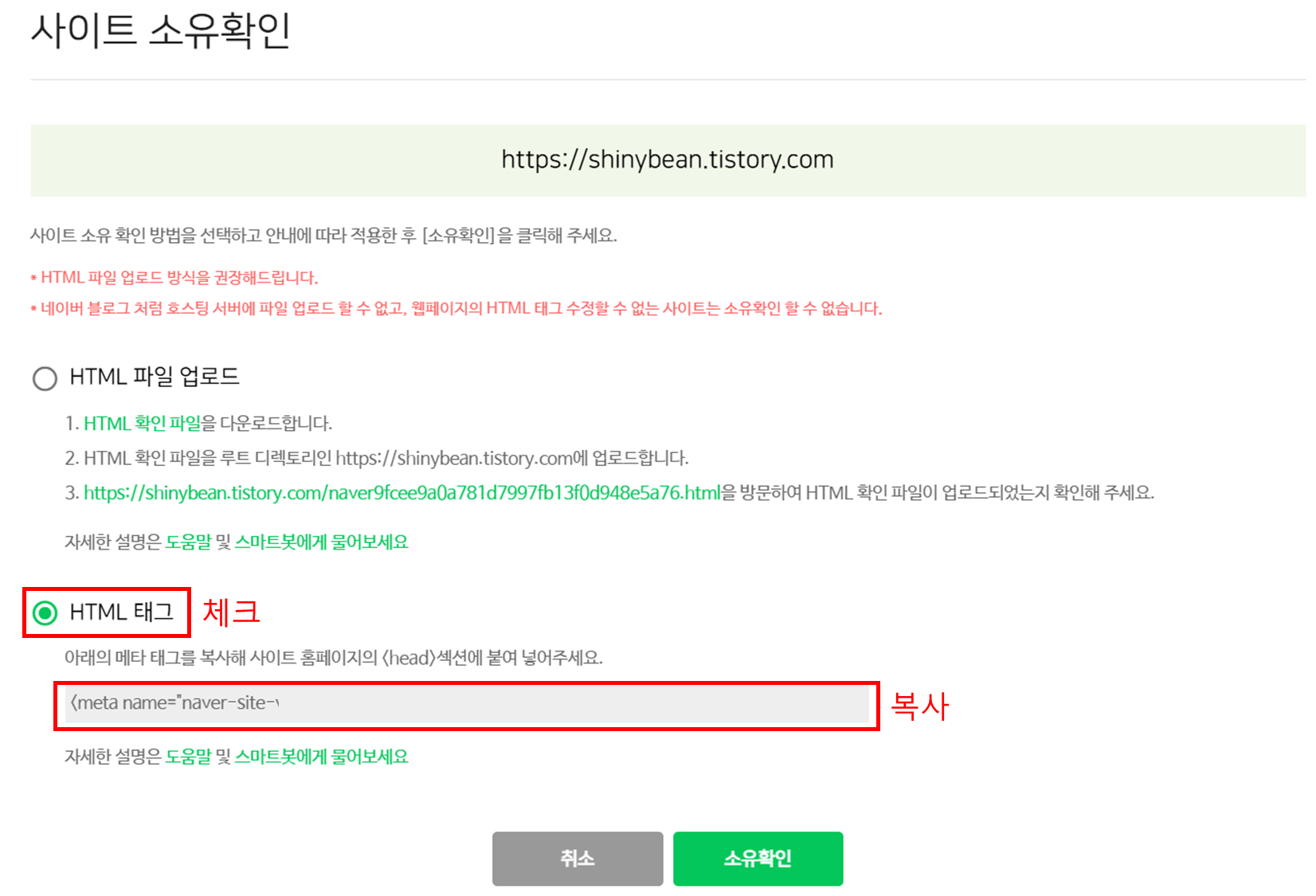4. 사이트 소유 확인 페이지가 나온다. 다른건 건들이지 말고 HTML 태크로 체크 후 밑의 태그를 복사한다.