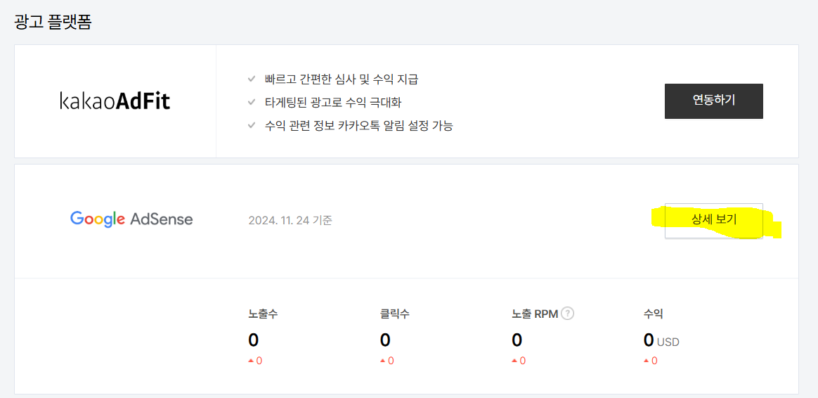 연동하기 클릭 후 애드센스 신청한 구글 계정과 연동 시 상세보기로 바뀐다,